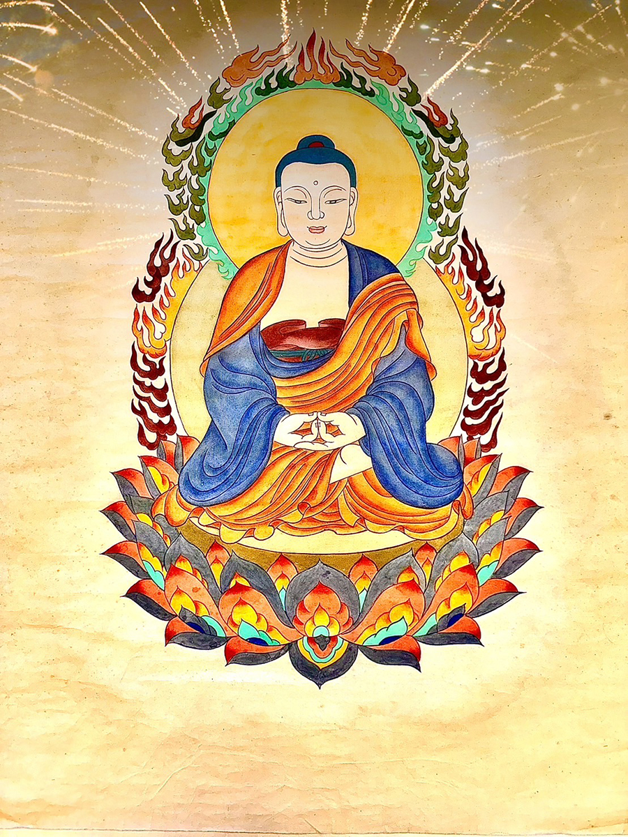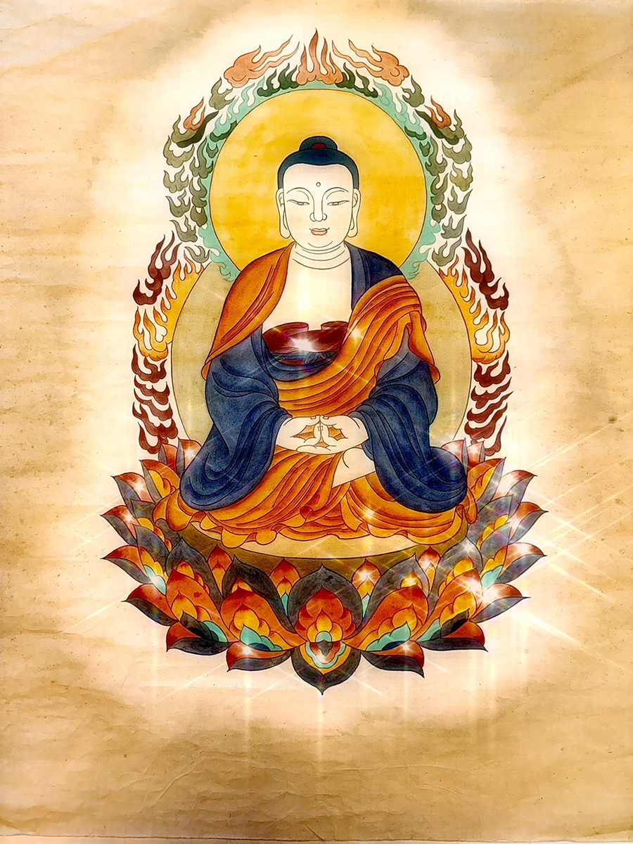 〈阿彌陀佛〉其實是梵文皈依無量光佛的音譯,「阿彌陀」是佛的名號,阿彌陀佛的能力比其他佛更加偉大。《大無量壽經》記載釋迦牟尼佛曾說過:無量壽佛〈阿彌陀佛〉,威神光明,最尊第一,諸佛光明,所不能及,是一位家喻戶曉慈悲喜捨的大願王。阿彌陀佛的悲心深切、慈心廣大,以觀世音菩薩及大勢至菩薩為脅侍,在極樂淨土實踐教化、接引眾生,合稱「西方三聖」。