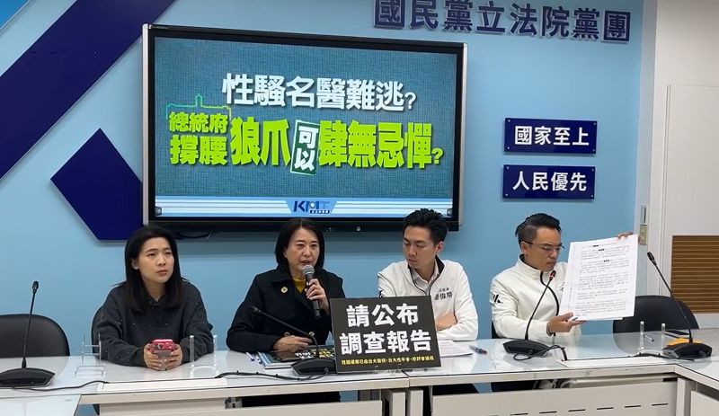 國民黨立法院黨團首席副書記長王鴻薇、副書記長廖偉翔、立委徐巧芯、洪孟楷等人,在立法院國民黨團記者室召開「性騷名醫難逃?總統府撐腰,狼爪可以肆無忌憚?」記者會。