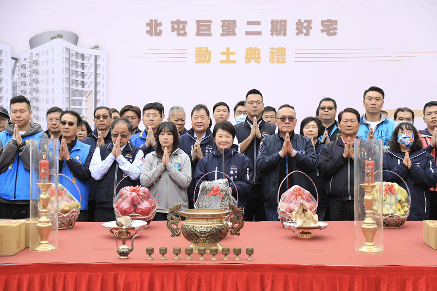 台中市北屯區巨蛋二期好宅動土典禮,市長盧秀燕、市議員陳成添、謝家宜、劉士州、都發局長李正偉、民政局長吳世瑋、社會局長廖靜芝、住宅處長陳煒壬、北屯區代理區長徐宏銘及北屯區多位里長出席,立法院副院長江啟臣、立委楊瓊瓔、何欣純、黃健豪、台中市議會副議長顏莉敏、市議員沈佑蓮、曾朝榮也派代表共襄盛舉。