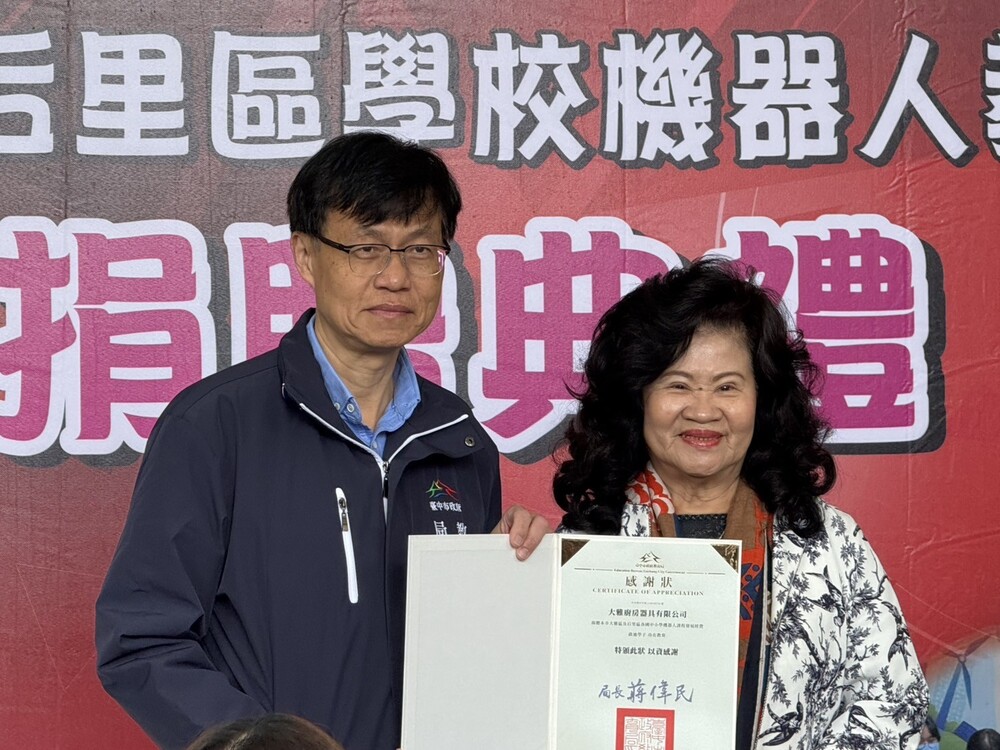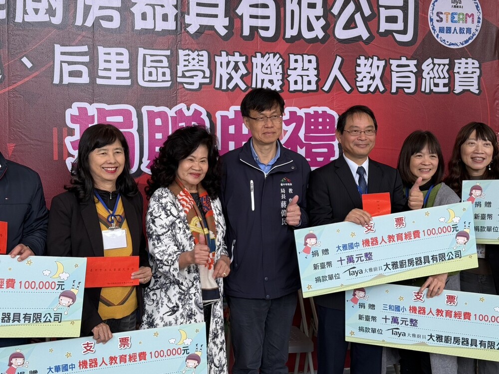【記者王雲彬、馬淑娟大雅報導】大雅廚房器具有限公司捐贈台中市大雅及后里區各國中小計20所學校,每校10萬元,共計200萬元經費協助學校發展機器人課程,日前於大雅國中舉辦捐贈儀式。教育局長蔣偉民出席表示,感謝大雅廚具公司對大雅及后里區各國中小學校學生們關懷付出,持續協助學校充實機器人課程器材與設備,讓學生們可以得到更完善的學習空間與資源。