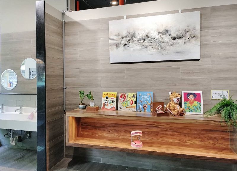 這種設計風格,引起學生翻閱興趣,再走進閱讀站閱讀,自然就不會錯過任何一本好書。尤其,廁所內的原木色調與溫暖燈光,帶出質樸的氛圍,與微風、窗外的自然景觀對話,營造出溫暖與高質感的空間。