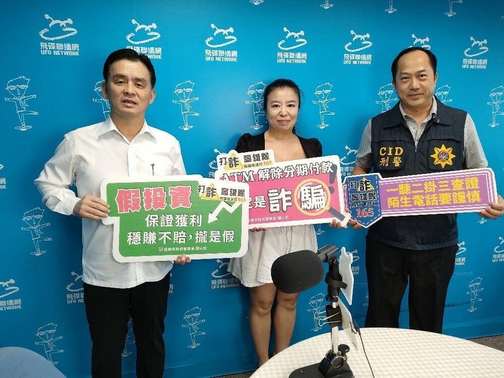 蔡鴻謀分局長表示,希望聽眾朋友聽完後也能將這些防詐知識與案例故事後,要廣為分享給親友知道,並提醒「網路交友談情不談錢」、「投資專員到府取款必定有詐」及「不要購買來路不明的演唱會票券或委託他人代搶代購」等防詐小秘訣;警方也會持續強化各項防詐騙宣導作為,持續參考打詐儀錶板中的各項大數據資料調整宣導內容,期望能有效守護民眾財產,降低受害機會。獻聲說故事,苓雅分局長蔡鴻謀〈左一〉與飛碟電台合作反詐騙宣導。(圖文:記者張福全)