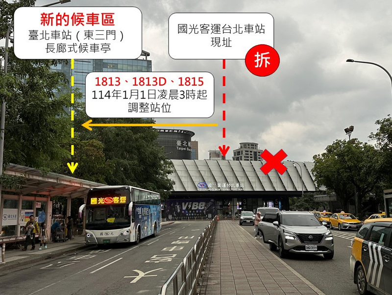 【記者張毅基隆報導】國光客運台北車站預定自明年1月1日凌晨3點結束營業,往基隆方向受影響的國道客運共3線,分別為1813路(基隆轉運站-臺北車站)、1813D路(基隆轉運站-基隆中山區=臺北車站)及1815路(新北市金山區-基隆大武崙地區-臺北車站),臺北車站端上下車位置將調整至「臺北車站(東三門)」長廊式候車亭,提醒基隆市民多加留意。