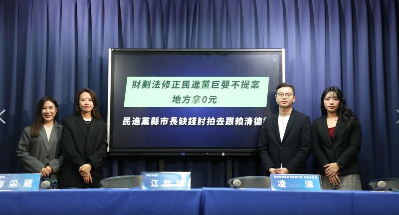 國民黨新北市議員江怡臻、台北市議員柳采葳、桃園市議員凌濤、發言人楊智伃25日下午召開「財劃法修正民進黨巨嬰不提案、地方拿0元、民進黨縣市長缺錢討拍去跟賴清德說」記者會。柳采葳指出,民進黨在高雄有八席立委、台南六席、嘉義縣兩席,屏東縣兩席、澎湖一席,總共19席的立委,對財劃法的提案在哪?反倒是國民黨的修法版本納入人口等多項指標,才符合公平正義。