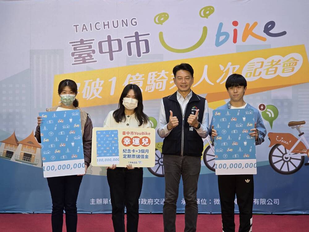 葉昭甫表示,為紀念YouBike騎乘突破1億人次的新高紀錄,市府與微笑單車特別送出第1億人次幸運兒名古屋雙人來回機票一張的獎品,除此之外,第1億人次的前後兩名使用者將獲贈Moxy酒店住宿券,再往前後兩名則可獲得臺中市公共自行車1億人次紀念悠遊卡及3個月TPASS儲值金,一同歡慶臺中市提供YouBike服務,由民眾從租借騎乘過程,合力達成破億人次的騎蹟。