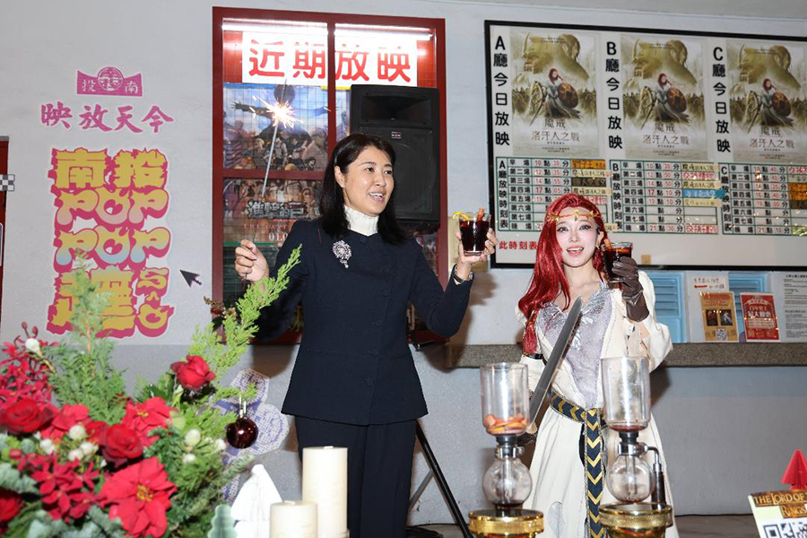 【記者陳良安南投報導】聖誕節瘋派對!百年南投戲院精心策劃一場Y2K千禧復古風聖誕趴,縣長許淑華與變裝成「魔戒」電影赫拉公主的知名Coser(角色扮演者)楊哲,一起將盤踞在戲院前簷上的大型「POP POP蛇」,以及宛如薑餅屋的戲院建築上滿佈的聖誕燈飾點亮「瞬間放閃」!令滿場參加的民眾驚豔,也為活動掀起高潮。