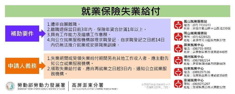 高屏澎東分署表示,「失業給付」是勞動部幫助失業勞工度過失業期間的補助政策,失業勞工應主動告知公立就業服機構就業或兼職之事實,唯有誠實告知就業情況,失業給付才能領得安心踏實;若對「失業給付」有任何疑問,都可上台灣就業通網站(https://www.taiwanjobs.gov.tw)查詢,或撥打免付費客服專線0800-777-888由專人給予協助,或至高屏澎東分署的鳳山、岡山、屏東、潮州、台東及澎湖等6個就業中心(站)洽詢!