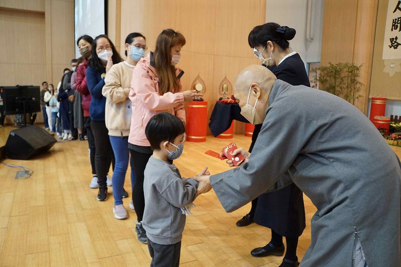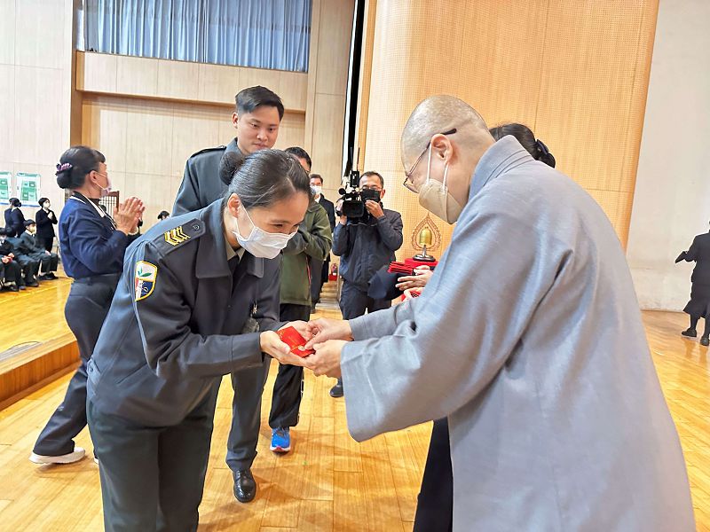 國二和氣黃玟羽的爸爸剛好與其他三位國軍夥伴在學校進行招生,因下午中學部師生皆在活動中心參與歲末祝福,總務主任把握因緣主動邀約參與。玟羽爸爸表示之前參加過仁德靜思堂的歲末祝福,此次是第二次參加校園的歲末祝福,在現場也親自示範並指導其他國軍弟兄問訊及上台領紅包之動作。其他國軍夥伴也跟總務主任表示,這是一次相當不錯的體驗,看到慈濟大藏經之後,感受到慈濟將感恩與慈愛散發到全世界,各地都有慈濟人的身影,經由歲末祝福更加了解慈濟學校及慈濟志業。