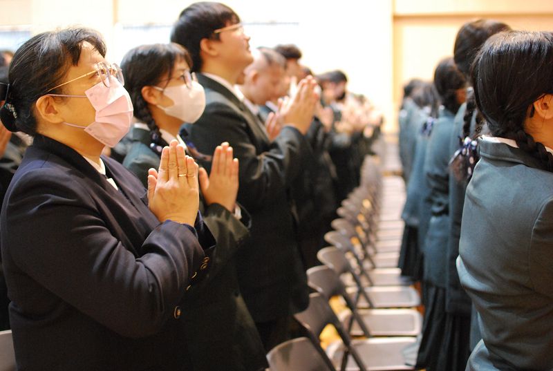 德英師父帶領大眾虔心祈禱,引用歌曲中的詞句「化解惡緣結善緣」,說道在這樣寒冷的冬天,世界各國中還有人沒有乾淨的水可以喝,沒有溫暖的衣服可以穿,沒有房子可以住。我們能生長在這個環境中,都是很有福的孩子,希望藉由今天歲末祝福的法會祝福每一位同學都能心想事成,可以健健康康、平平安安過好每一天。在虔誠的〈祈禱〉歌聲中,祝福2025年是一個平安吉祥的福慧年,也十分感恩臺南慈濟高中歲末祝福典禮圓滿順利。(撰文:蔡憶琦、攝影:林曉瑩、林育吟、陳駿朋、黃富美、黃丞皞、簡志雄)