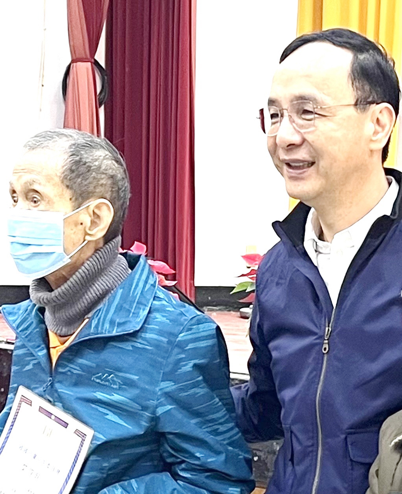 今年11月30日黨慶大會,蔡朝成因黨齡80,受朱立倫主席贈獎表揚,我向他致賀拍照留念。謝國樑市長對蔡朝成老先生,高齡當義工照顧學童,非常敬佩,重陽敬老,特別請邱佩琳副市長代表到蔡家拜訪致意。