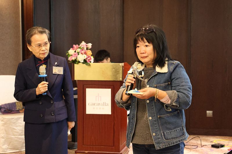 捐贈者李凱明的妻子帶著他的塑像上臺分享。她很感恩能遇到李明哲醫師,因為20年前就是李醫師幫她先生動手術,讓他們夫妻倆可以陪伴孩子成長;而且當年陪伴爸爸回診的小女孩,在李醫師的鼓勵下,長大後念了護理系,現在也在花蓮慈濟醫院從事護理工作。去年先生往生後捐出眼角膜,她感恩受贈者,可以讓她的先生持續看見人間的美好。下臺時,李明哲院長也給她最溫暖的擁抱和祝福。