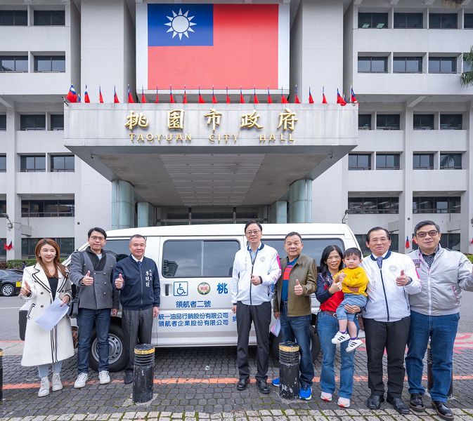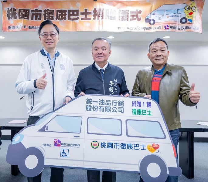 【記者吳惠民桃園報導】桃園市長張善政30日上午在桃園市議會副議長李曉鐘、市府社會局長陳寶民、桃園區長許敏松、統一油品行銷公司創辦人徐順永及其家人等人陪同下,於市府出席「統一油品行銷公司復康巴士捐贈儀式」。