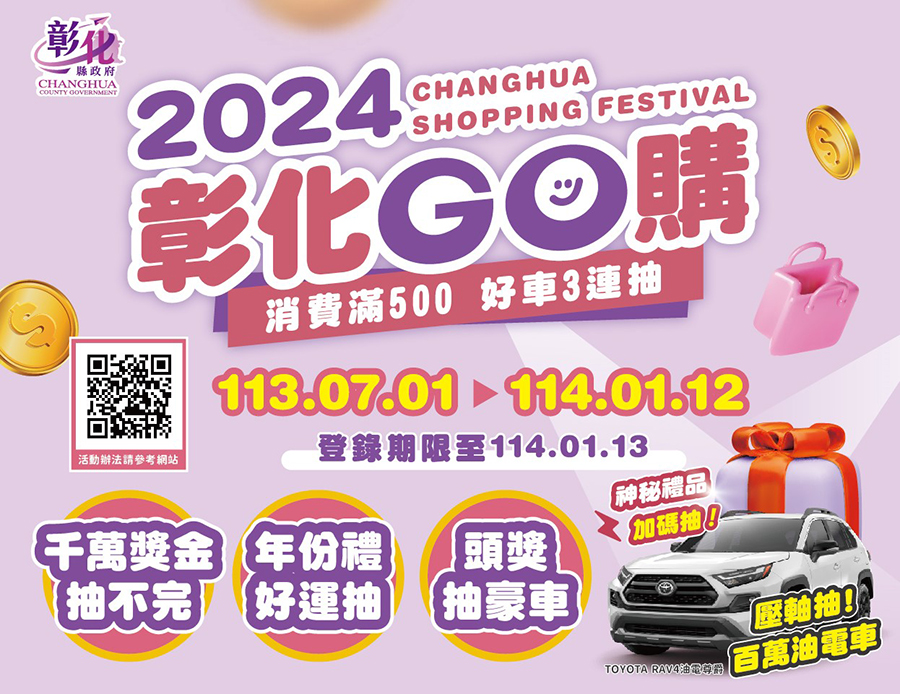 為刺激彰化經濟,鼓勵民眾消費,彰化縣政府Continue,持續推陳出新,推動消費抽獎活動至今已邁入第四年,今年最特別的獎項,莫過於連抽三臺好車,以及大家最期待的阿璋肉圓、中興米等年份獎,只要113/7/1~114/1/12期間,在彰化縣內消費滿500元,拿發票或收據到指定活動網站登錄,就有機會把百萬名車開回家,歡迎大家相招來彰化旅遊、消費。
