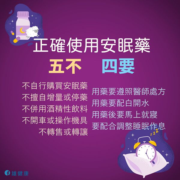 衛生局提醒民眾使用鎮靜安眠藥應遵守「五不」及「四要」原則,以確保用藥安全,「五不」為「不自行購買鎮靜安眠藥、不擅自增量或停藥、不併用酒精性飲料、不開車或操作機具、不轉售或轉讓」;而「四要」係「用藥要遵照醫師處方、用藥要配白開水、用藥後要馬上就寢、要配合調整睡眠作息」。
