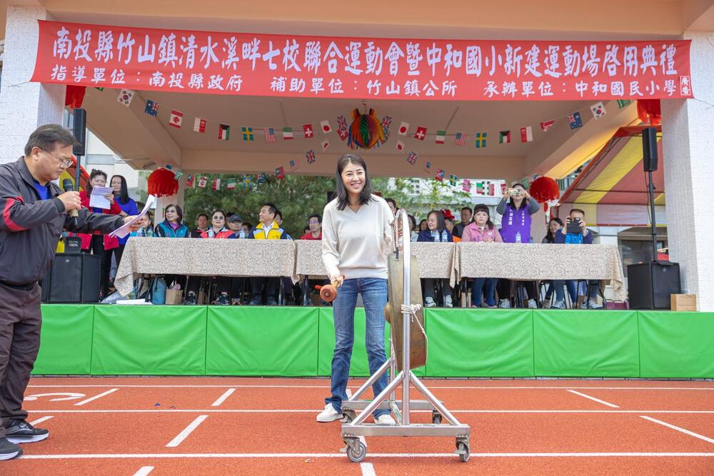 【記者陳良安竹山報導】「竹山鎮清水溪畔七校聯合運動會」4日在中和國小盛大登場,剛整建完成的中和國小操場也同步落成,縣長許淑華到場主持運動會開球儀式,並敲鑼三聲宣布操場正式啟用,她表示,感謝議會對縣府在教育經費上的支持,縣府將不斷加強學校軟硬體設備,讓孩子有更好的學習環境。