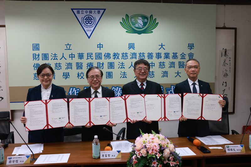 中興大學校長詹富智、佛教慈濟慈善事業基金會執行長顏博文、台中慈濟醫院院長簡守信及慈濟大學校長劉怡均,於2025年1月2日共同簽署合作備忘錄,兩校四方將合作推動學術研究及公益實踐的結合,開創學界、醫界及慈善界多贏合作局面。