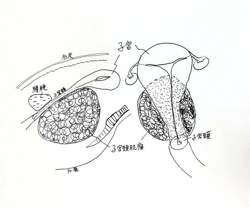 這病人的肌瘤位置長在子宮頸很特殊,體積大且非常靠近子宮內頸,龐渂醛主任說,肌瘤切除後,將無可避免的造成子宮內頸有開口,如果不修復好內頸通道,未來經血將出不去,會衍生新的問題。子宮頸內頸是小小的管狀結構,並位於骨盆底,若用腹腔鏡一針一針的縫合開口,無論是從角度和深度來說都相當困難,即便縫得到也不一定針針縫得好。