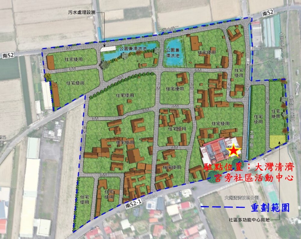 地政局長陳淑美表示,本案大灣農村社區土地重劃辦理面積約為7.35公頃,其中可建築土地面積約5.42公頃,公共設施面積約1.93公頃,公共設施規劃配置有綠帶、生態滯洪池兼公園、社區多功能中心用地、污水處理設施用地及道路等,並以農村特色意象融入公共設施設計中,結合防災、景觀休憩、人本交通及友善環境等概念推動農村社區土地重劃,請區內土地所有權人給予支持推動,以促進大灣社區建設發展更為完善。