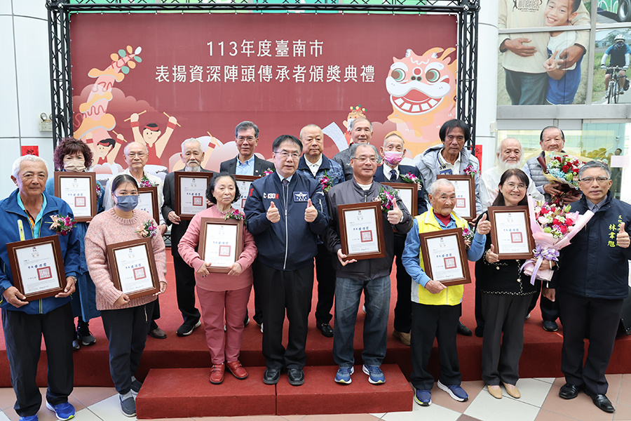 【記者鄭永德台南報導】臺南市政府為推廣陣頭文化傳承,於去(113)年訂定《臺南市政府文化局表揚資深陣頭傳承者作業要點》,包含高齡102歲的「建興師」何國昭等15位陣頭教練通過審查。14日辦理頒獎典禮,由市長黃偉哲親自頒獎,他感謝陣頭教練們長期秉持傳承與創新精神,指導並帶領陣頭發展,豐富臺南文化底蘊。市議員李中岑、陳皇宇、沈震東及方一峰也到場祝賀。