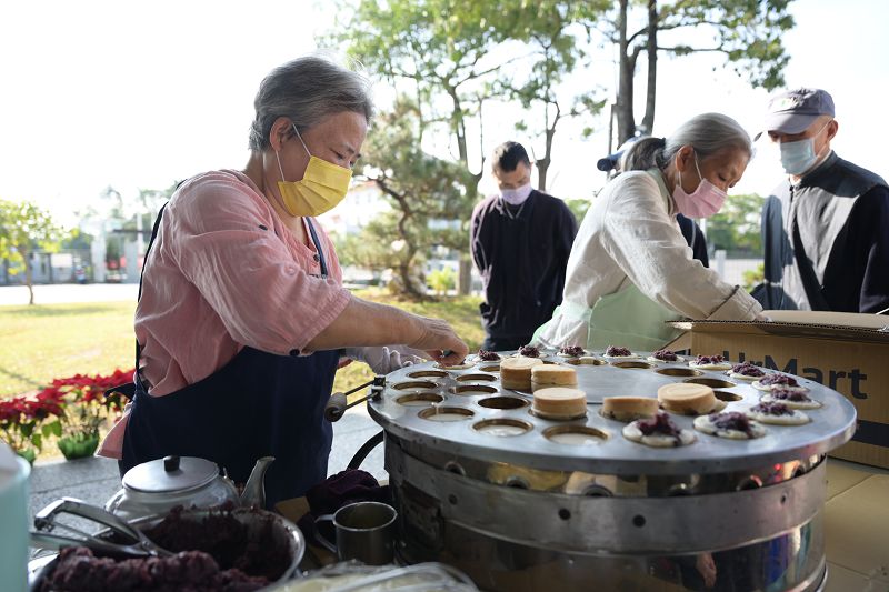 活動外場,紅豆餅攤位前總是吸引無數人駐足,陣陣香氣撲鼻而來,溫暖了冬日的寒意。志工張梅英與萬菊紅,數十年來道心堅固投入公益,用熟練的手藝和無私的愛心,製作一份份飽含溫度的紅豆餅。每一口酥香餡甜的紅豆餅,傳遞著她們對服務的熱忱與對來賓的關懷。