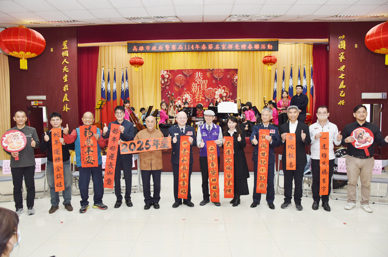 高雄市警察局為迎接蛇年春節到來,營造年節熱鬧氣氛,特於15日早上9時至12時15分,在3樓大禮堂舉辦書法名家寫春聯免費贈送活動,邀請前消防局長蕭季慧、中華美術家協會會長王海峰與秘書長羅慧、日本國際現代書道展會友陶繼文老師、警局前秘書室主任鍾永慧,以及現職官警王智勇、徐全、林右庭、王泳崎、鍾村武等10人現場揮毫;為增添春節年味,還邀請苓雅區中正國小國樂團,現場演奏「金蛇狂舞」、「採茶樂陶陶」、「追追追」、「滿山春色」等曲目,讓全場充滿歡樂氣息。警察局長林炎田除祝福「蛇舞春風,萬事如意」,也特別感謝同仁在過去1年的辛勞付出,期勉春節期間能堅守崗位,讓市民朋友們平安過好年,並落實中央目前治安重點政策「5打7安」工作,持續掃蕩黑、金、槍、毒、詐,努力打造高雄成為宜居城市。(圖文:記者于欽智)