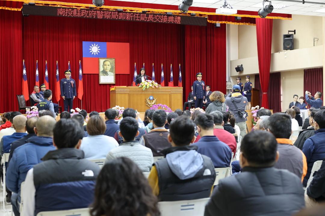 【記者陳良安南投報導】南投縣警察局日前舉行卸、新任局長交接典禮,由縣長許淑華親臨主持,內政部警政署主任秘書郭士傑監交;與會來賓計有縣議會秘書長李孟珍、臺灣南投地方檢察署檢察長黃元冠、法務部調查局南投調查站副主任汪楨喜、南投縣警察之友會理事長簡崇吉及多位議員、貴賓蒞臨共襄盛舉,場面隆重。