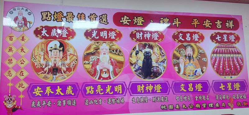 桃園姜太公廟總幹事邱春智也表示,2025為金蛇年,犯太歲者須安太歲,該廟即日起受理安太歲、點燈、奉禮斗、補運之報名事宜。禮斗項目包括:姜太公斗、文昌帝君斗、關聖帝君斗、中壇元帥斗、天上聖母斗、武財神斗、平安斗。點燈則有:七星燈、祈福平安燈、宮燈、太歲燈、太陽燈、太陰燈、光明燈、文昌燈、財神燈、姻緣燈。