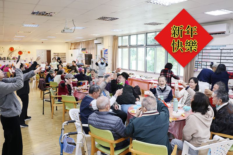 隨著一道一道料理的完成,教室裡充滿食物香氣,主任呂怡靜忙著擺盤,護理師廖苡惠忙著不讓長者閒著,照服員陳碧玉與楊彩菁因為要用大鍋快炒米粉,忙著到樓下跟香積師姐借廚房,看著兩人 大鍋大火快炒的模樣相當有趣,像外燴主廚一樣。忙碌一陣後,豐盛料理端上桌,玉濱阿公搖著獅頭跟大家拜早年,彼此道「恭喜」圍爐餐會開動了。