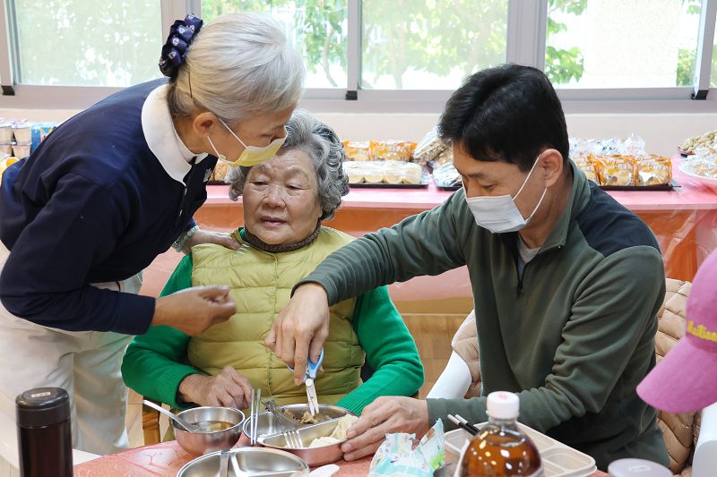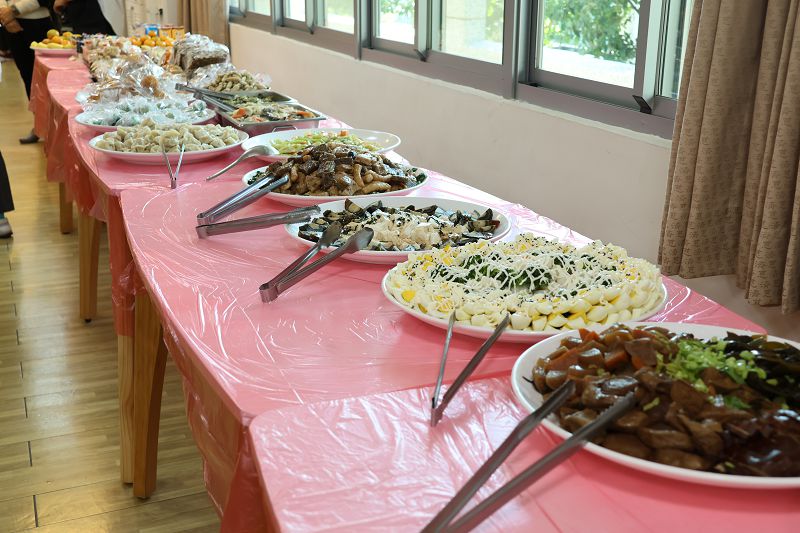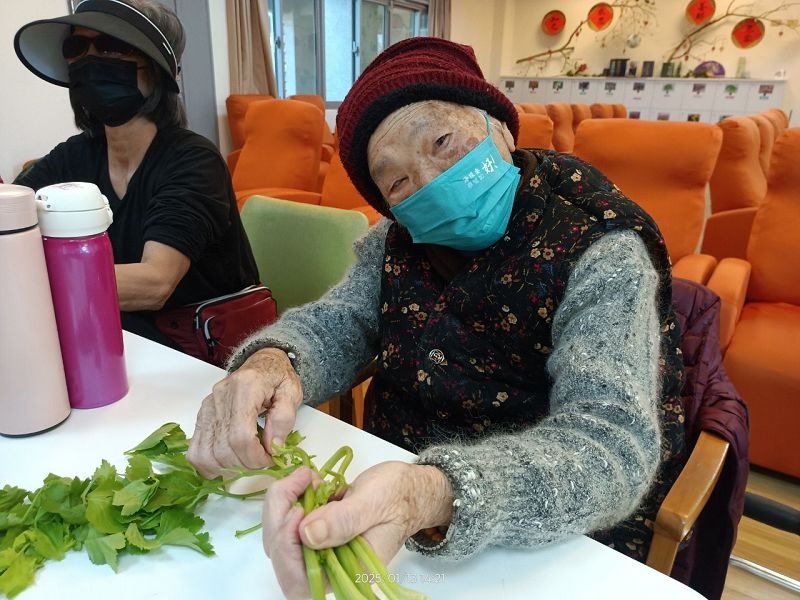 一早陽光溫暖的灑落清水靜思堂,照在忙裡忙外的日照同仁身上,你洗洗我切切的歡喜籌備,為的是歲末感恩餐會【我家出好菜】活動,照服員從幾天前開始擬菜單,連長者也一起動起來,前一天大家就開始挑菜撿菜,除了今天現煮的料理外,參加餐會的家屬也會帶一道菜過來,全場的素食美味料理席開六桌,超過60位的參與者,圍爐之餘還要感恩長期護持日照的志工老師,因為有他們的付出才有快樂正向的長者。