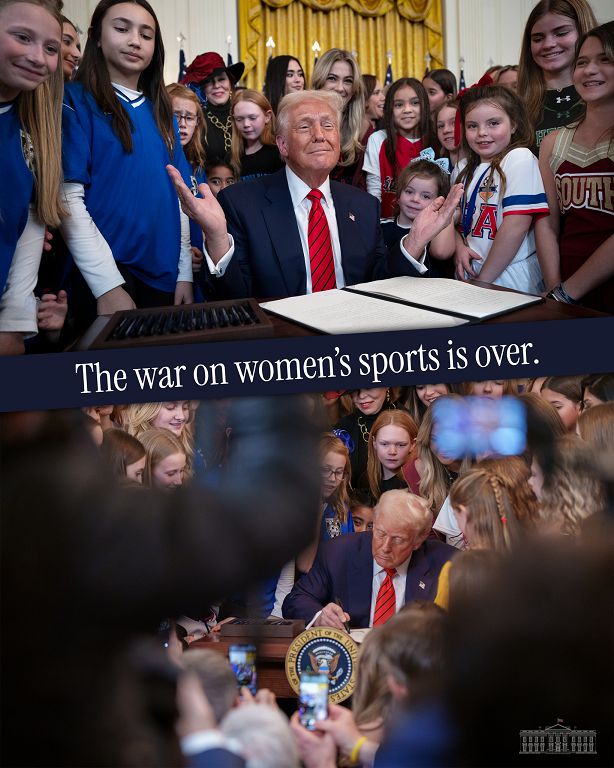 【本報綜合外電報導】美國總統川普5日簽署行政命令禁止跨性別女性參加女子體育賽事時,再度錯誤指稱兩名「變性的」金牌得主「以壓倒性勝利之姿掄元」,強調這道行政命令「讓女子體育的戰爭結束」。