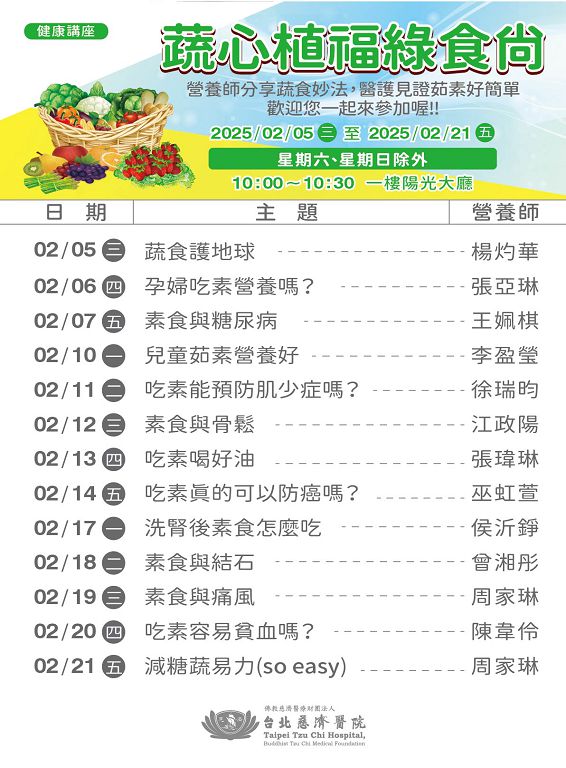 茹素不僅有益健康,更具有環保意義,為讓更多人了解茹素益處,台北慈濟醫院自2月5日起至2月21日,舉辦以「蔬心植福綠食尚」為主題的蔬食推廣系列活動,藉由營養師主講健康講座、茹素同仁心得分享與養生食譜教學等多元形式,向來院民眾傳遞最新穎的蔬食理念。