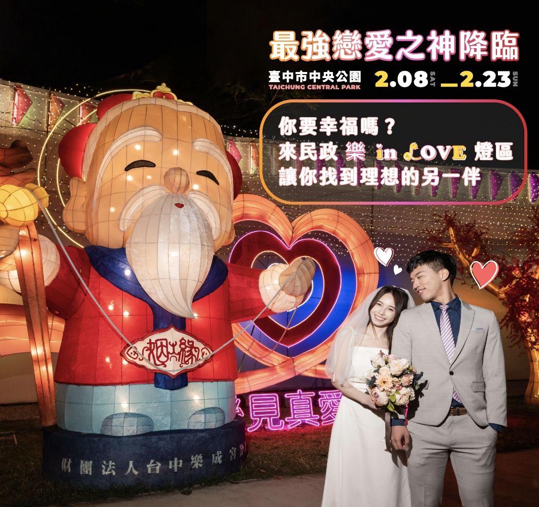 民政局說明,活動當日何董事長也會親自恭請月老星君與和合二仙前往燈區,還有執事人員扮演月老星君與大家互動。「樂 in LOVE」燈區除樂成宮月老坐鎮加持及29區浪漫燈組外,燈會期間每週六日、元宵節及情人節現場也規劃一系列精彩表演,包括啦啦隊、特技、管樂及舞蹈演出,還有各行政區輪番上陣展演。此外,2月14日情人節當日還有知名YouTuber團隊「一起上學吧」為單身男女進行隨機配對活動,讓你尋覓有緣人!