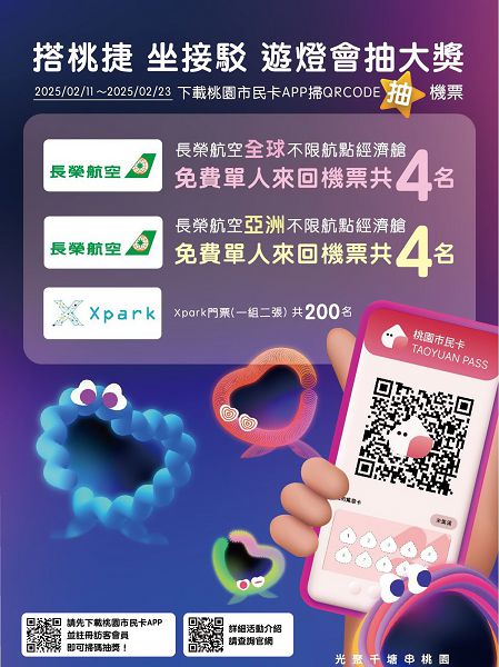 【記者徐玉英桃園報導】桃園市政府為鼓勵全國遊客搭乘公共運輸暢遊「台灣燈會」,特別舉辦「搭桃捷 坐接駁 遊燈會抽大獎」活動,民眾只要於燈會期間下載桃園市民卡APP完成會員註冊,即可於桃園捷運車站車廂、公車接駁站或公車內掃描活動QR Code集章,就有機會獲得長榮航空全球不限航點免費單人來回機票等大獎。