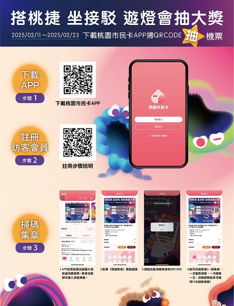 智慧城鄉發展委員會說明,活動期間,遊客只需註冊並登入「桃園市民卡APP」,進入APP內的「搭桃捷 坐接駁 遊燈會抽大獎」專區開啟掃描功能,並於桃園捷運車廂、桃園捷運A15大園站至A22老街溪站、活動接駁車接駁站(中路風禾接駁站、泰豐輪胎接駁站、楊梅接駁站及內壢假日接駁站)及前往青埔的接駁公車內掃描指定QR Code(活動海報)即可獲得集章,累積一次集章即有一次抽獎機會,每人活動期間最高可獲得13次抽獎機會。