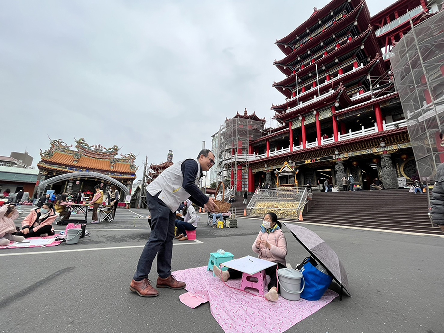 【記者張朝福嘉義報導】親子寫生比賽是嘉義市慶元宵的代表性活動之一。9日一早,廟前廣場已齊聚數百名親子一同寫生,嘉義市政府民政處林家緯處長、教育處長郭添財及觀光新聞處副處長范書銘也特別代表黃敏惠市長到場與九華山地藏庵董事長黃俊森共同分送糖果,為參賽的小朋友們送上甜甜鼓勵。