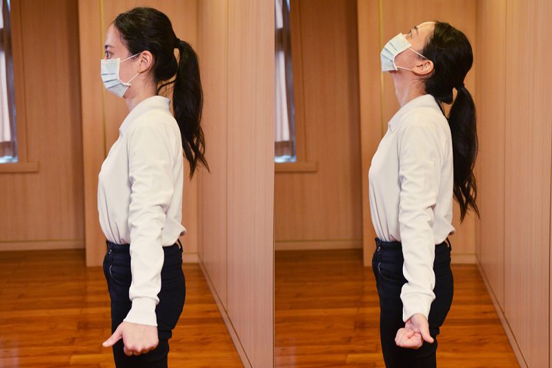 雙手放鬆垂放身體兩側,距離臀部約10-15公分。雙手握拳並豎起大拇指朝前。接著將大拇指往外旋轉,抬頭看向天花板並維持5-10秒鐘,藉此舒緩頸部與胸部的緊繃。