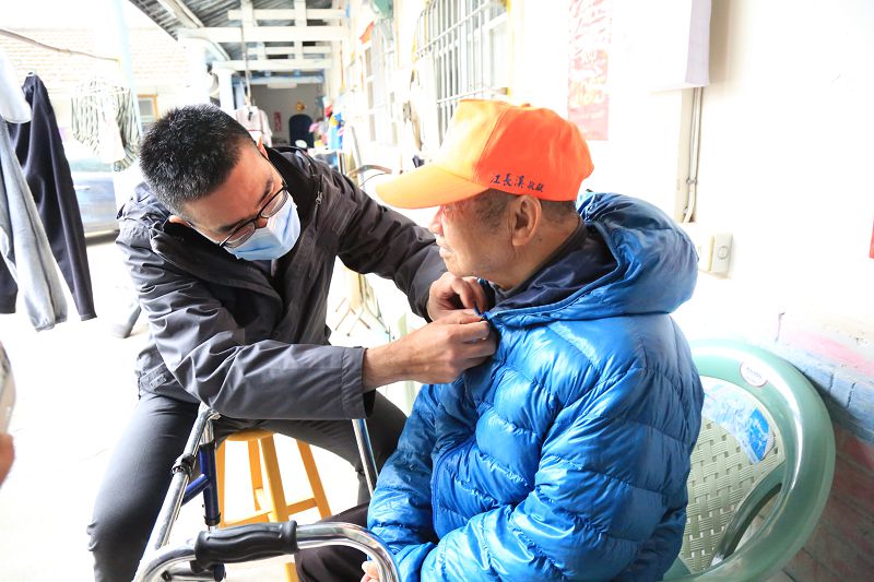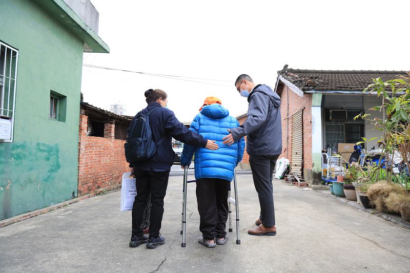 老爺爺於前幾個月因心肌梗塞,經大林慈院緊急搶救裝置支架,簡掁宇醫師關心其健康情況,經量測血壓,血壓值偏高,醫師及藥師關懷其用藥情況及血壓紀錄,叮囑要按時服藥,注意保暖,並陪伴老爺爺以助行器輔助行走,在庭院走動活動筋骨。