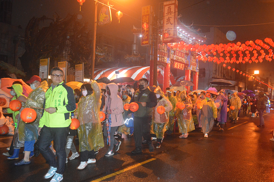 【記者楊川欽台中報導】台中市梧棲區朝元宮媽祖廟於12日晚上,舉行年度提燈踩街活動,由於天氣不佳,從前一天晚上就開始全台降雨,導致元宵節當天陰雨綿綿,這項活動原本不被看好,但仍吸引數百民眾穿著雨衣到場參加,原本仍下著雨的情況,在廟方帶領群眾開始繞街提燈慶祝時,雨勢竟然停歇,讓此一活動順利進行,直到眾人返回廟前並完成抽獎後離去,下雨情況才又恢復,如此情境,讓人再次見証到媽祖神跡,也讓朝元宮在天氣不佳情況下,仍然如期舉辦一場熱鬧的宗教盛會活動。