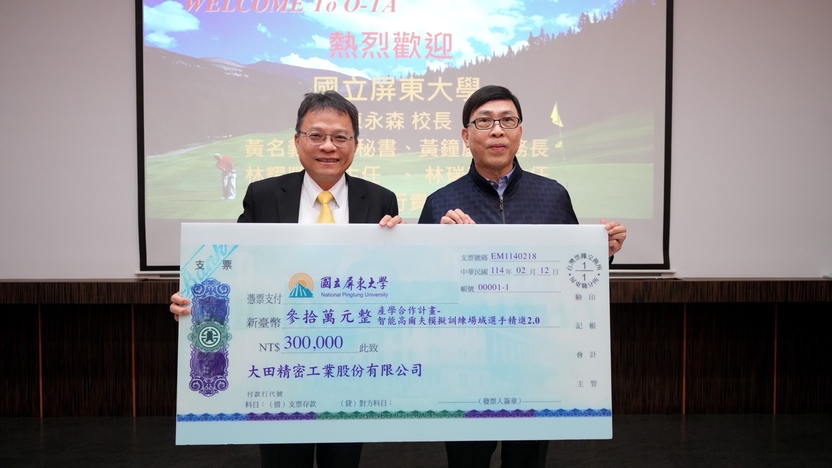 大田精密李孔文董事長致詞表示,非常榮幸與屏大合作互動,大田精密是高爾夫球具專業製造廠商,期盼在教育及體育有所回饋,能協助屏大學生職業高爾夫選手獲得訓練資源,感到非常欣慰,也期待屏大學生職業高爾夫球選手未來取得更好成績。在致詞中,李董事長更與屏大師長講述大田精密未來更進一步發展,因應世界經貿關係及市場需求,即將在越南平陽省開設大田越南新廠,期待在臺越雙邊產業人才培育方面,能夠與屏大未來有更進一步產學合作。