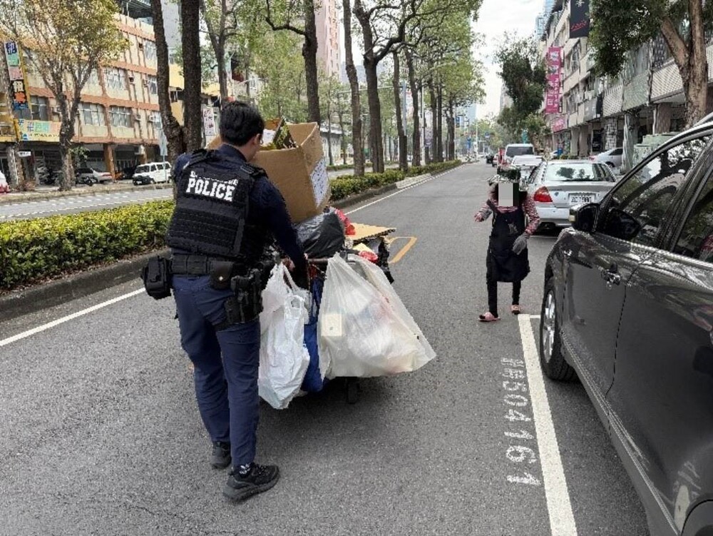 苓雅分局成功路派出所警員黃祖豪、何佩貞日前中午巡經中華四路與苓雅二路口時,看見一名婦人在馬路旁撿拾散落於車道的回收物,遂主動上前關心。老婦雖有一台手推車運載回收品,無奈因回收物過多,且寒風陣陣的吹,將物品吹落於車道,且因逢紅綠燈號變換之際,婦人急於推車過馬路,又擔心遺落在車道上的物品會妨害用路人的安全,不知該如何是好。警組熱心上前協助,先幫忙撿拾掉落的回收物,再將手推車推至路旁適當處所,另一員警則在後方指揮交通,確保婦人、用路人及員警的安全。一切就緒後,員警向婦人確認身體無恙,且為避免後續交通狀況,協助婦人將回收物綑紮牢固,婦人非常感謝2位員警貼心舉動,讓嚴寒的冬天中也能感受社會處處有溫情。(圖文:記者張福全)