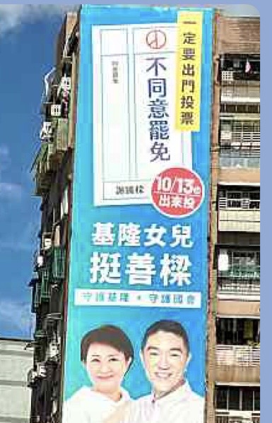 基市支持謝國樑市長的,為了讓選民了解罷免票是什麼樣子,特別掛出巨幅的海報在高樓的牆壁上,選票只有兩欄;是五個字的「不同意罷免」另外一欄是四個字的「同意罷免」出門去投票,如果不同意罷免就在「不同意罷免」上面蓋O,如果「同意罷免」當然就在同意罷免上面蓋O。