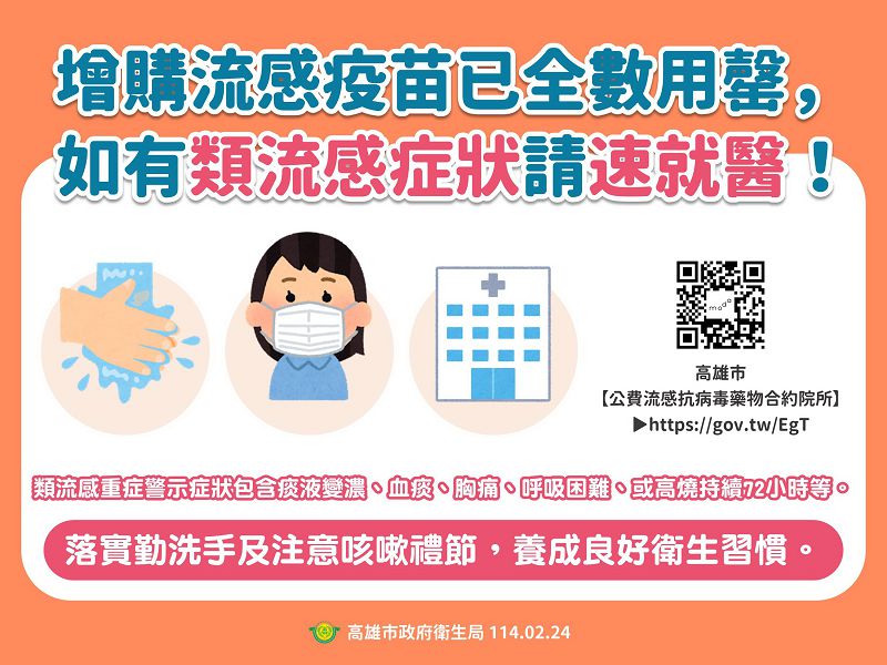 衛生局表示,對於流感疫情,民眾應注意個人手部衛生和口罩防護,如有症狀儘速就醫,可避免感染或引發重症的風險。尤其,疾病管制署自去年12月15日起,至今年3月15日止,擴大公費流感抗病毒藥劑使用條件,增列「有類流感症狀,且家人/同事/同班同學有類流感發病者」為使用對象,