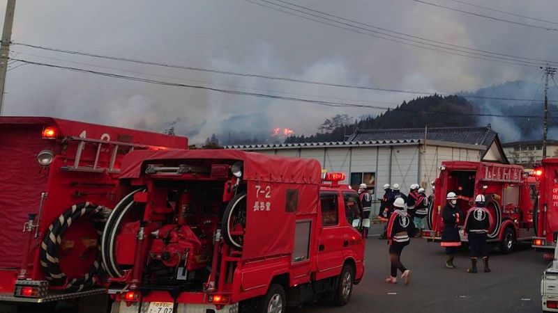 消防人員持續從地上與空中努力滅火,避免火勢蔓延到住宅,包含自衛隊直升機在內,共有14架直升機從空中灌救。NHK直升機2日上午從空中拍攝到的影像可見,三陸町綾里地區與赤崎町合足地區等地,好幾處山林冒出白煙。