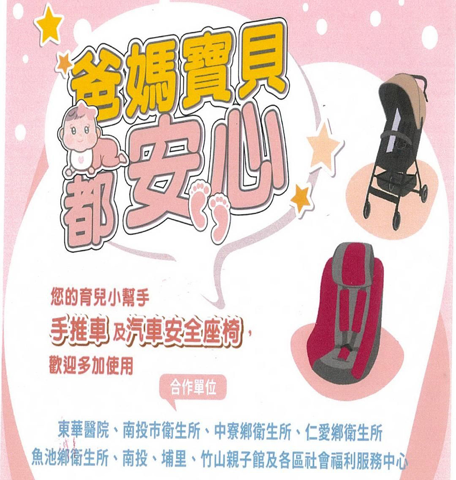 【記者陳良安南投報導】南投縣政府為了讓有嬰幼兒家庭在外出至親子館(托育資源中心)、醫療院所、衛生所及社會福利服務中心等單位洽公時,有免費之嬰幼兒安全工具可以使(借)用,特別提出「提供嬰幼兒手推車及安全座椅使用服務試辦計畫」,以保護寶寶搭車及外出安全,歡迎有嬰幼兒家庭至單位洽公時可多加使用。