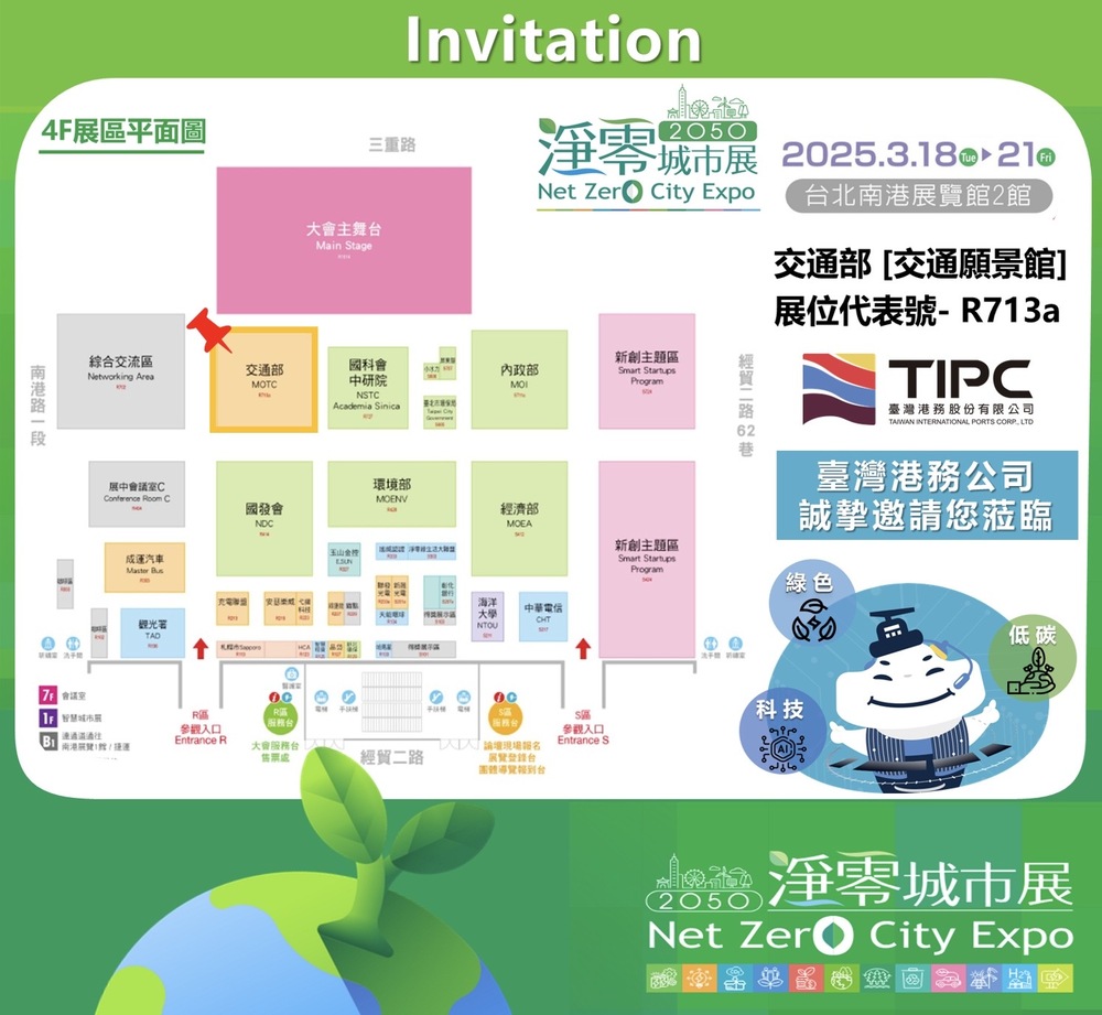 因應全球邁向數位科技與淨零轉型浪潮,港務公司推動「臺灣港群智慧轉型計畫」,導入智慧科技實現港口數位與永續雙軸轉型。「2050淨零城市展」,以「智慧科技打造綠色永續港灣」為主題,展現智慧能源管理、植栽數位管理及低碳運輸物流園區等推動亮點,展覽將於2025年3月18日至21日在台北南港展覽館2館4樓舉行,港務公司攤位設於「交通願景館」(R713a),誠摯邀請各界蒞臨參觀。