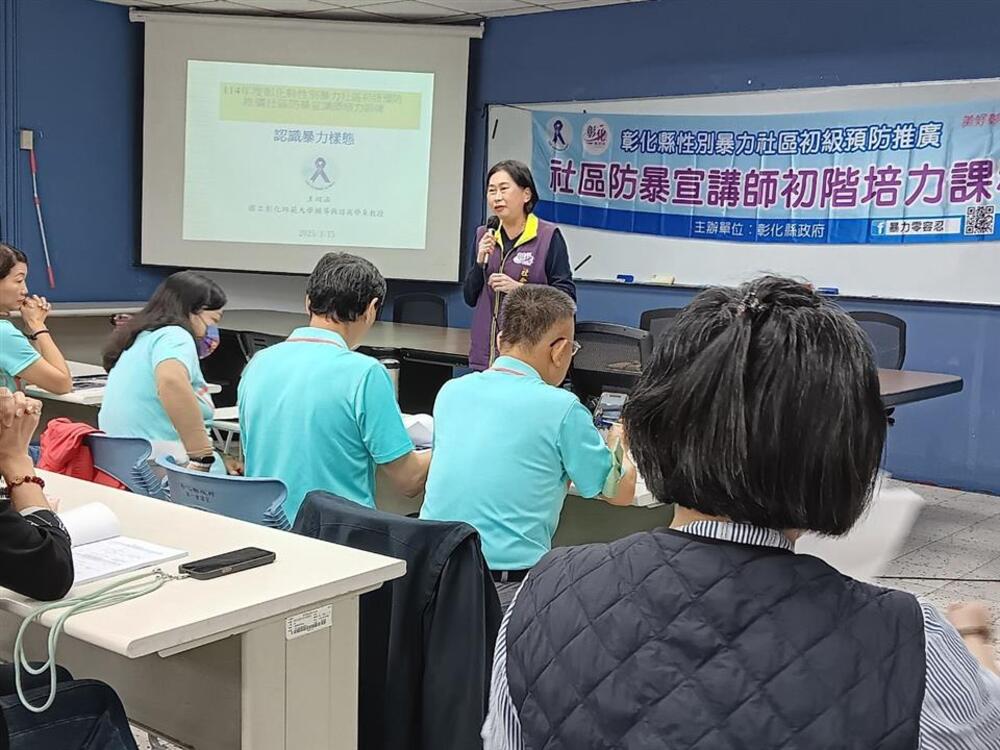 【記者鄭惠珠彰化報導】彰化縣政府多年推動社區紮根培力、守護天使宣導、守護志工培力訓練、大專生洄游社區紮根計畫,為持續深耕家庭暴力防治初級預防工作,減少家暴熱點盲區,擴大防治宣導的觸角,推動培育社區防暴宣講師於本縣各社區角落紮根。為此,縣府於3月15日、16日辦理社區防暴宣講師初階培訓課程,邀請彰化師範大學諮商輔導系王翊涵老師、嘉南藥理大學社工系吳敏欣老師、詹惠如宣講師、黃姿綺宣講師等人講授課程及分享實務經驗。