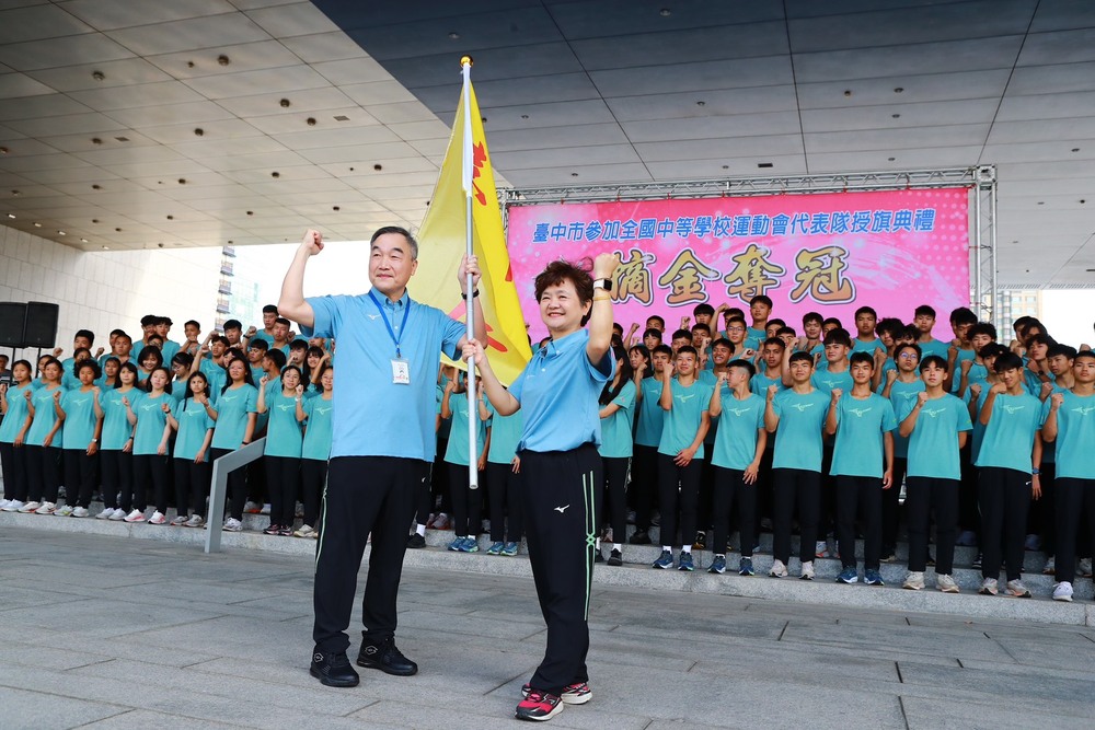 【記者彭勝郎台中報導】114年全國中等學校運動會19日在台南市開幕,台中市副市長黃國榮代表市長盧秀燕在市政大樓府前廣場為中市學校代表隊授旗及致贈加菜金,期勉各校展現實力,再創佳績,為台中爭取最高榮譽;另體育總會副秘書長蘇瓊月代表也致敬加菜金給代表隊,市府教育局副局長郭明洲、專門委員劉姵君也到場為選手加油打氣。