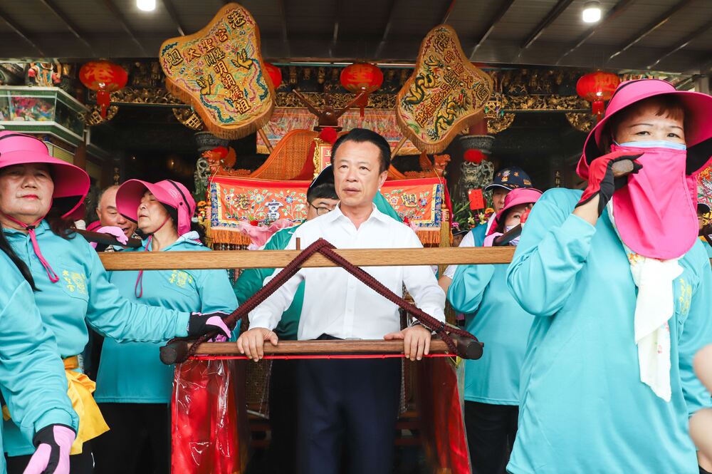 【記者謝敏政嘉義報導】嘉義縣布袋鎮魍港太聖宮19日舉行年度媽祖遶境活動,縣長翁章梁、立法委員蔡易餘前往參拜,並親自請下媽祖神尊抱上神轎,隨後一同扶轎出巡,儀式莊嚴隆重,吸引全村信眾參與。