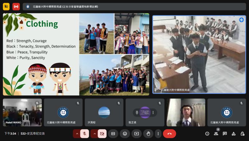 本次交流活動中,慈大附中學生以生動活潑的方式介紹台灣原住民族文化,內容涵蓋傳統服飾、祭典儀式、飲食特色與建築風格,展現台灣豐富多元的文化底蘊。學生分別介紹布農族的生活方式與飲食習慣,並說明射耳祭與八部合音的文化意涵;介紹達悟族時,除了詳述飛魚季的傳統活動,也藉由圖片、影片與地圖,讓來自內陸國家的史瓦帝尼學生更具體感受到海洋民族的生活樣貌。此外,同學們亦關注原住民族當前所面臨的困境與挑戰,期盼未來有更多交流與對話的機會。