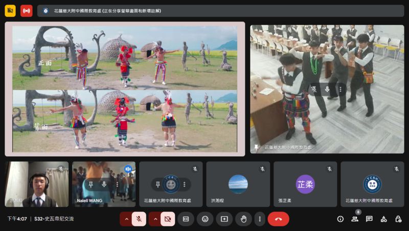 值得一提的是,阿美族的介紹引發熱烈共鳴。學生講述阿里嘎蓋(Alikakay)巨人族的傳說,並介紹茅草屋頂的建築特色,與史瓦帝尼傳統茅草屋相互呼應。在慈中同學分享的尾聲,兩校學生攜手共舞花蓮縣原住民族聯合豐年節大會舞「汎札萊 今天」,為這場文化交流留下溫馨美好的回憶。